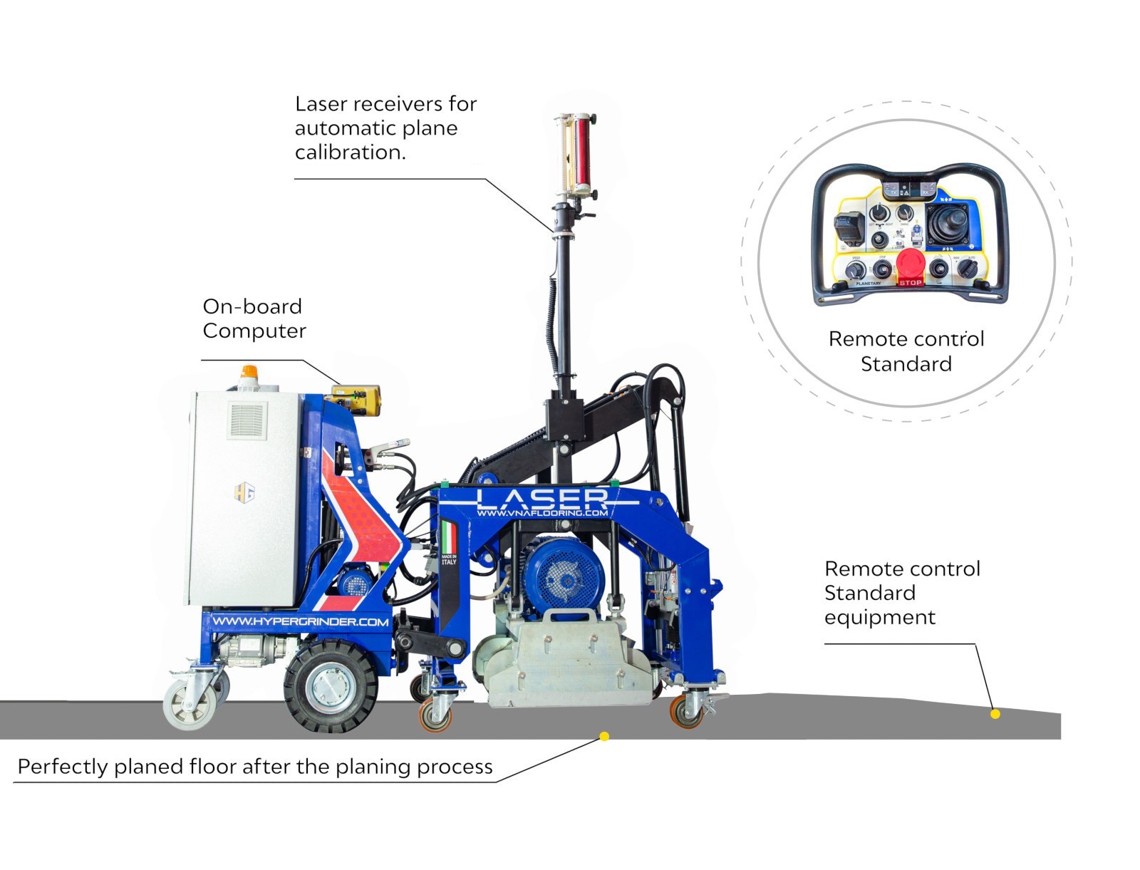 Excluding the laser system the HYPER FLAT FLOOR GRINDER is transformed into a radio-controlled floor grinder suitable for floor preparation or for concrete mirror polishing (HYPERCONCRETE®).